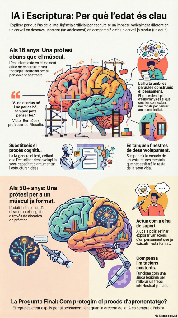 Un chaval de 16 años está en una situación radicalmente diferente. Está en el momento crítico de construcción de su aparato cognitivo. Cada texto que escribe con esfuerzo, cada párrafo que reescribe buscando claridad, cada argumento que intenta articular – todo eso está cableando su cerebro, construyendo las estructuras neuronales que le permitirán pensar con complejidad durante el resto de su vida.